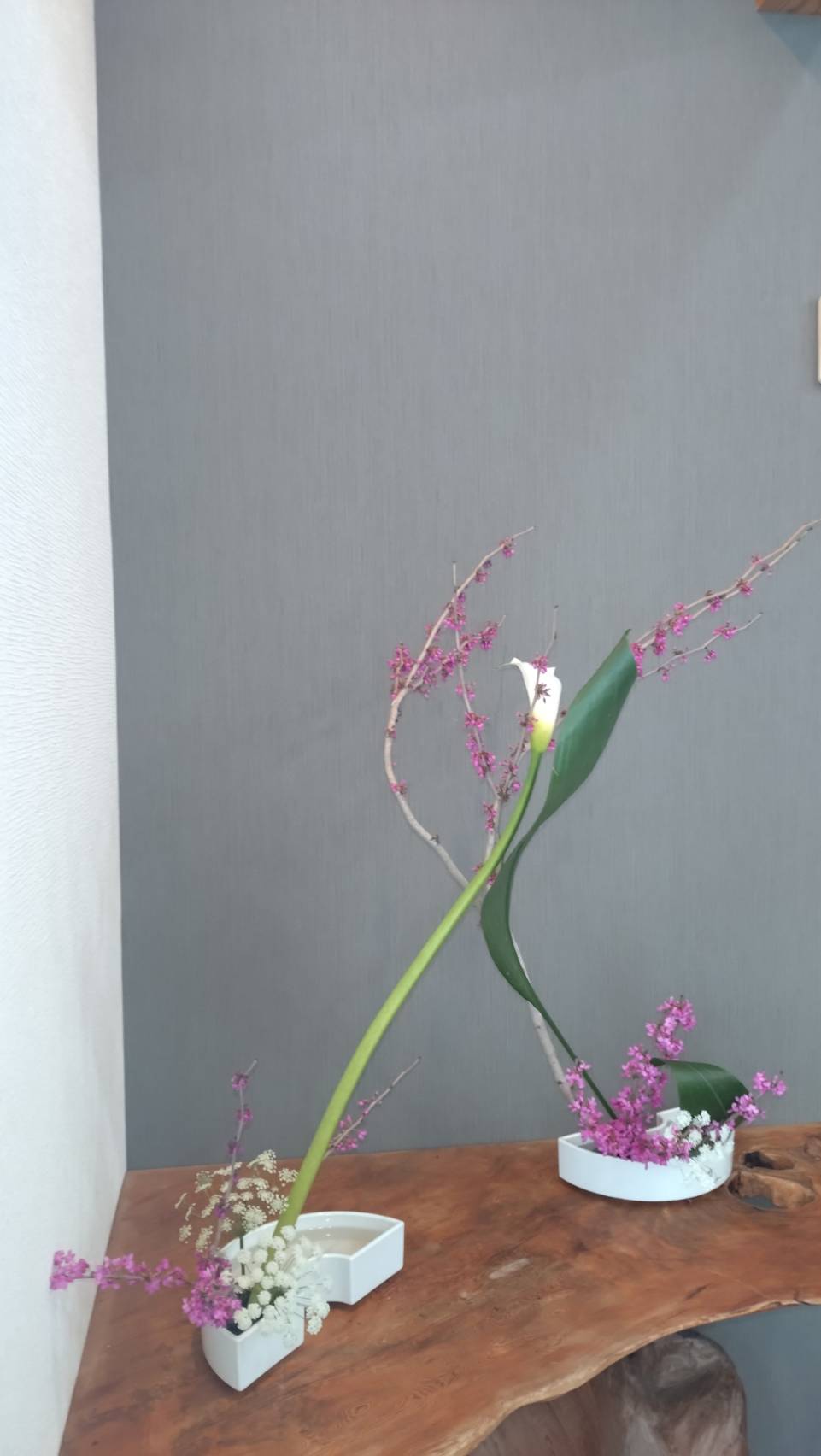 ハナズオウは春を告げる色 素敵な枝ぶりのハナズオウがありましたので、「花舞(はなまい)」という形で生けました。この華やかなピンクは今の季節ならでは。寄り添い合わせた白と緑に優しくマッチしています。 ハナズオウ カラー ハラン レースフラワー 2025年4月4日 投稿先 いけばな ← 過去の投稿へ 次の投稿へ →